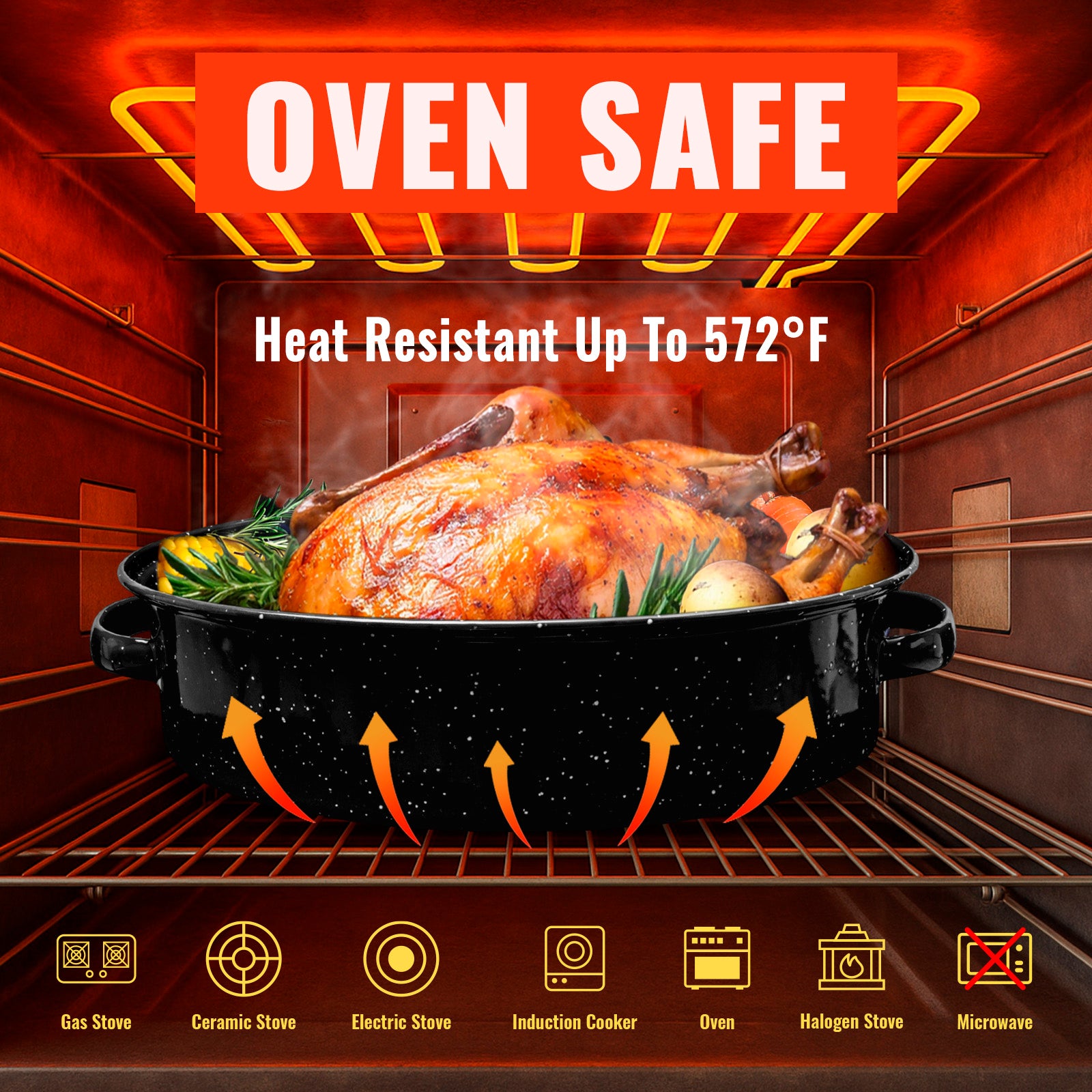 Bring professional roasting performance to your kitchen with the Anycook 18-inch oval roaster. Made of durable enameled steel, this pan heats evenly, resists high temperatures, and is much stronger than disposable foil pans.